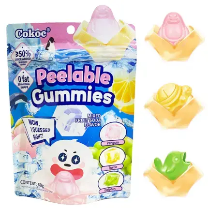 Cokoc Peelable Gummies Mixed Fruit Soda to chińskie żelki owocowe, które zdobyły popularność dzięki swojej unikalnej formie – można je “obierać” jak skórkę owocu. Po zdjęciu zewnętrznej warstwy żelek ukazuje się w kształcie zwierzątka, takich jak pingwin, żółw czy delfin. Smaki zawarte w opakowaniu to mieszanka owocowo-sodowa, przypominająca napój gazowany o smakach winogrona, białej brzoskwini czy lemoniady. Produkt jest dostępny w opakowaniach 60 g.
